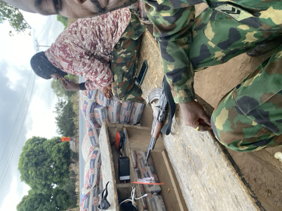 An outdoor scene in Zaki Biyem, Nigeria, depicts two individuals in military or paramilitary attire positioned at what appears to be a roadside checkpoint or fortified location