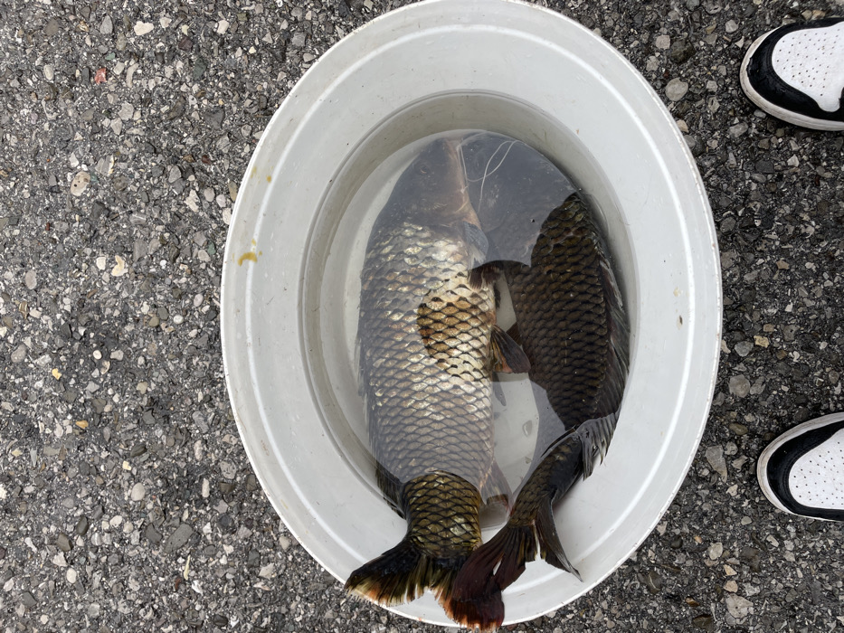 In Vranjina, Montenegro, an overhead shot captures a white, oval-shaped plastic bucket containing water and two fish, resting on a dark gray asphalt or paved surface with visible aggregate. The larger fish, identified as a carp, is positioned horizontally in the upper section of the bucket, displaying iridescent gold and brown scales, with its head oriented to the right. A smaller, darker-scaled fish is located beneath the larger one, also oriented horizontally with its head facing right. Both fish appear recently caught. A small yellowish smudge is present on the inner rim of the bucket near the top right. The tips of an individual's white and black sneakers are visible at the bottom left and right edges of the frame, indicating a person is standing over the bucket.