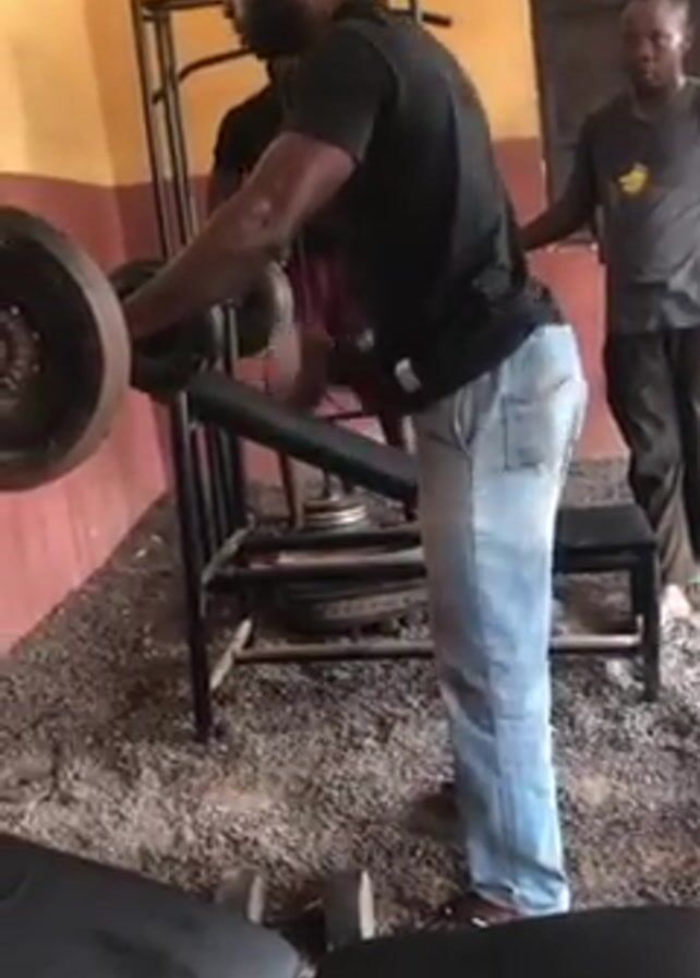 man lifting a barbell with circular weights that appear to be repurposed car rims in an indoor gym