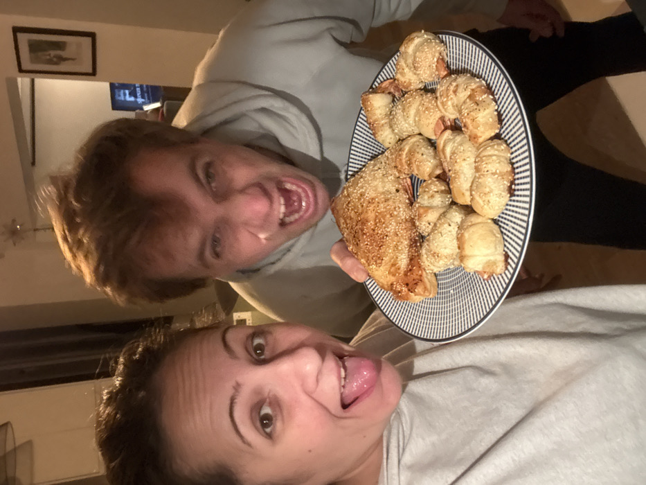 Two people are posing for a selfie with a plate of sesame-covered pastries. The person on top is a light-skinned male wearing a grey hoodie and making a wide-mouthed expression. Below, a light-skinned female sticks out her tongue playfully. A striped plate filled with various pastries, including what appears to be a large piece and several smaller, rolled items, is held between them. The background shows a glimpse of a room with a framed picture and a television.