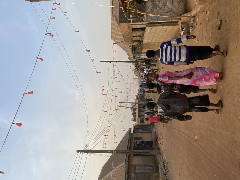 - "A sunny day in an African neighborhood shows a street decorated with strings of red, cone-shaped decorations hanging from electrical poles" by FM-upDEV2, licensed under CC BY 4.0