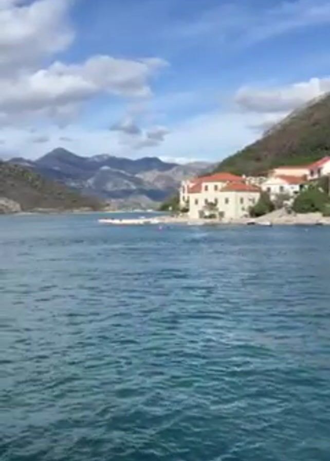 view from the water, likely a boat, towards a small coastal village with mountains in the background