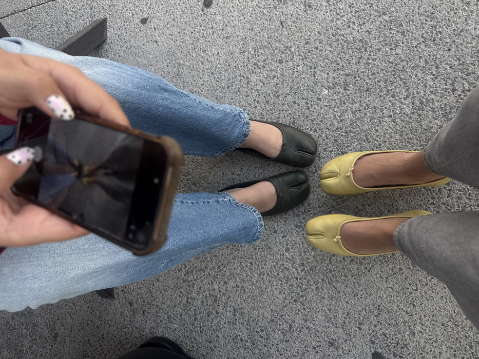 A person wearing jeans is taking a photo with their phone of two pairs of tabi shoes