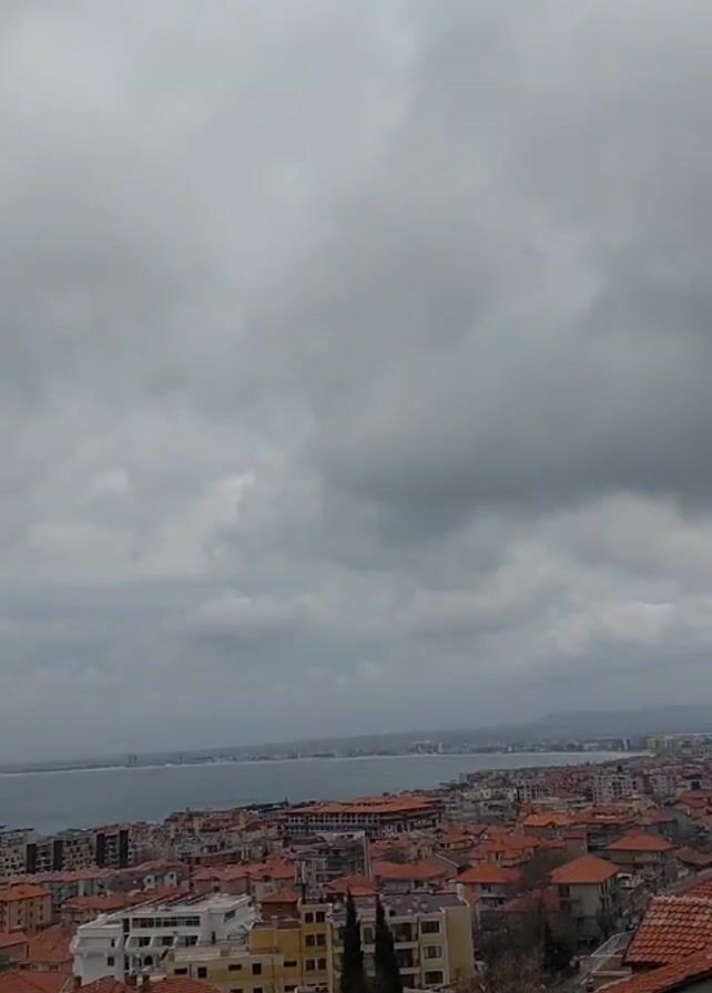 high-angle view of a town with predominantly red-tiled roofs under a cloudy sky. In the distance, the sea or ocean is visible, meeting the horizon. The cloud cover is extensive and gray, suggesting an overcast day. Buildings of varying heights are spread across the landscape, creating a dense urban environment. Some vegetation is visible, including trees interspersed among the buildings.