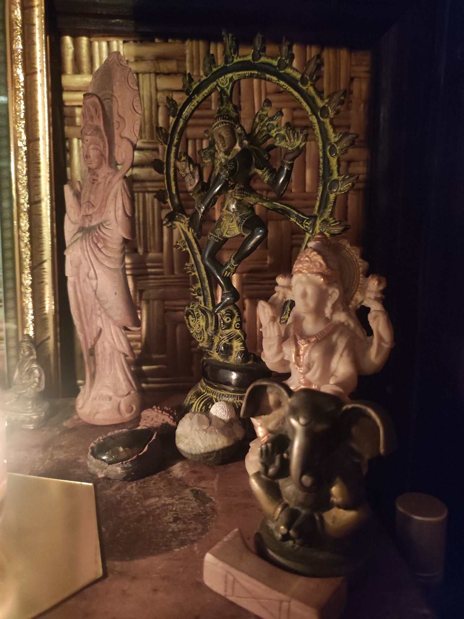 This image, captured in Ubud, Indonesia, displays an indoor arrangement of religious figurines and assorted objects on a dark, textured surface. On the left, a tall, light-colored carved statue of a standing figure, consistent with a Bodhisattva like Guanyin, is positioned next to a golden vertical frame element. Centrally, a dark bronze Shiva Nataraja statue depicts the deity performing a cosmic dance within an ornate, flaming halo. To its immediate right, a smaller, light-colored, multi-armed seated deity figure with golden adornments, likely a Hindu goddess such as Lakshmi, is present. In the foreground-right, a dark metallic Ganesha statue sits upon a light-colored wooden block. Other foreground objects include a dark, irregular dish containing a dark substance, a cluster of white crystalline rocks, and a flat, golden, reflective plate on the far left. The background features a woven bamboo panel. The scene is dimly lit, illuminated by a warm light source from the lower left, casting reflections on metallic and polished surfaces.