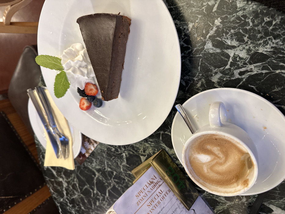 The image depicts an overhead view of a table setting within an indoor cafe or restaurant in Prague, Czechia, specifically consistent with **Grand Café Orient in the House of the Black Madonna**