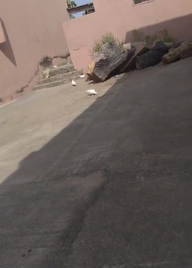 cement yard between two pink buildings, with three white doves walking and standing on the cement. To the right, there is a pile of rocks with some greenery. The buildings have simple architecture, one with a window boarded up. The sky is visible, with a hint of blue. The ground has dark grey patches. The overall lighting suggests it is daytime, casting a shadow over the yard.
