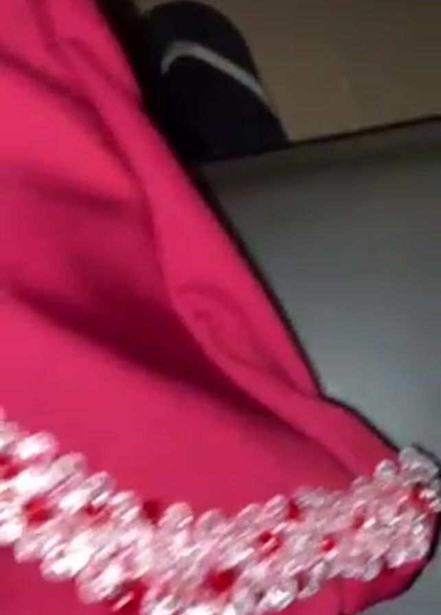 section of a reddish-pink piece of fabric with a string of clear and red beads along its edge