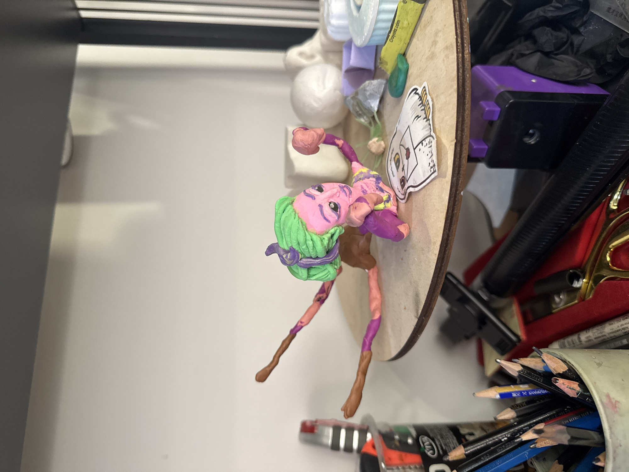 cluttered drawer filled with various art supplies and objects. The drawer appears to be located in a home or studio setting. The primary subject is a hand-made clay figure with green hair and a purple headband. The figure is lying on a circular wooden surface. Additional items in the drawer include a container of pencils, paint tubes, clay pieces, a purple plastic object, a white ball, and miscellaneous art supplies. The location in the city of Batumi, Georgia, is not apparent in the image.