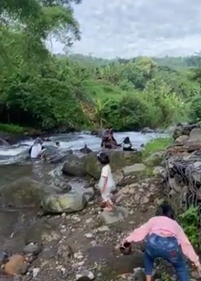 lively scene near a flowing river or stream. Several people, adults and children, are in the water. The adults appear to be supervising the children as some of them are bathing or playing in the water. On the rocky banks of the river, two young girls are visible. One girl wears a white outfit and the other is in a pink jacket and jeans. They appear to be exploring the rocks. The environment is lush, with green trees and plants surrounding the river. The sky is partly cloudy, suggesting it is either early morning or late afternoon. There are rocks and vegetation along the riverbank. The water is moving rapidly through the riverbed.
