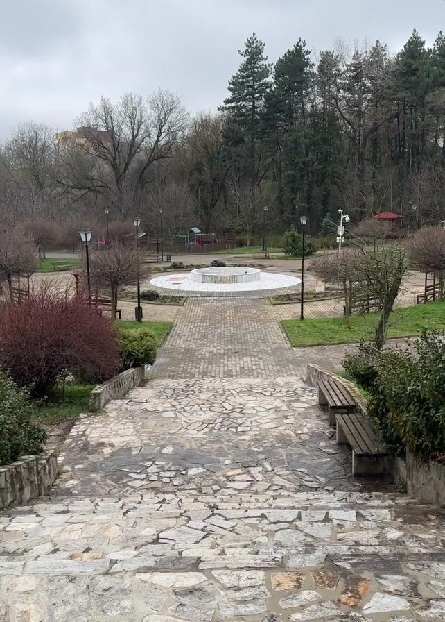 public park on a cloudy day. The camera is positioned at the top of a set of stone steps, looking down towards a circular fountain in the center of the park. A paved path leads from the base of the steps to the fountain. There are benches on either side of the path near the steps. Trees and bushes are scattered throughout the park. In the background, beyond the fountain, there are taller trees and a few structures, possibly a playground and a gazebo. No people are visible in the frame. The scene is still and quiet.