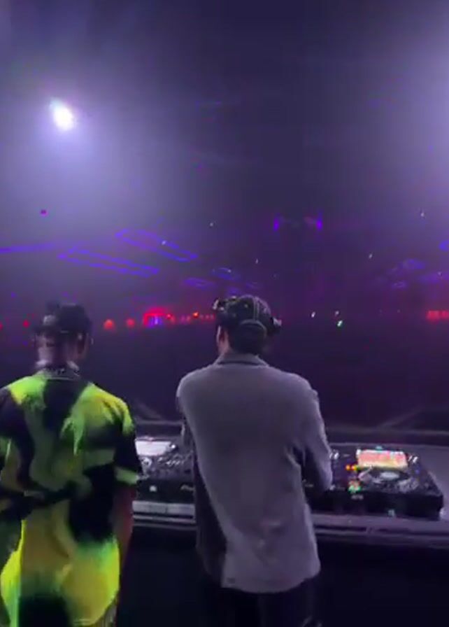 Two DJs are working at a large music venue, standing at a DJ console. The DJ on the right wears a gray shirt and has headphones on. The DJ on the left wears a green and black tie-dye shirt. In the background, a crowd of people is visible, illuminated by bright white and purple stage lights. Streaks of light add to the energetic atmosphere.