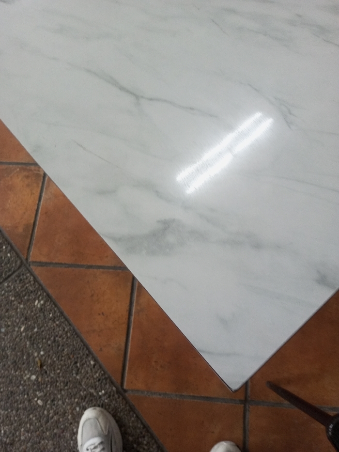 A high-angle shot captures the corner of a white, marble-patterned surface, likely a table or countertop. Part of the surface reflects a bright light. Around the edge, there is brown tile and grey asphalt. A pair of shoes are barely visible in the bottom left and bottom right. One shoe is gray; the other is white.