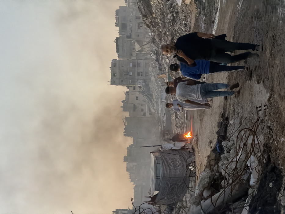 A group of people stand amidst rubble and destruction, with partially collapsed buildings in the background. A fire burns near the group. A dark, smokey sky suggests a recent or ongoing conflict. The overall atmosphere is one of devastation and resilience. The ground is uneven and covered with debris, suggesting a war torn place.