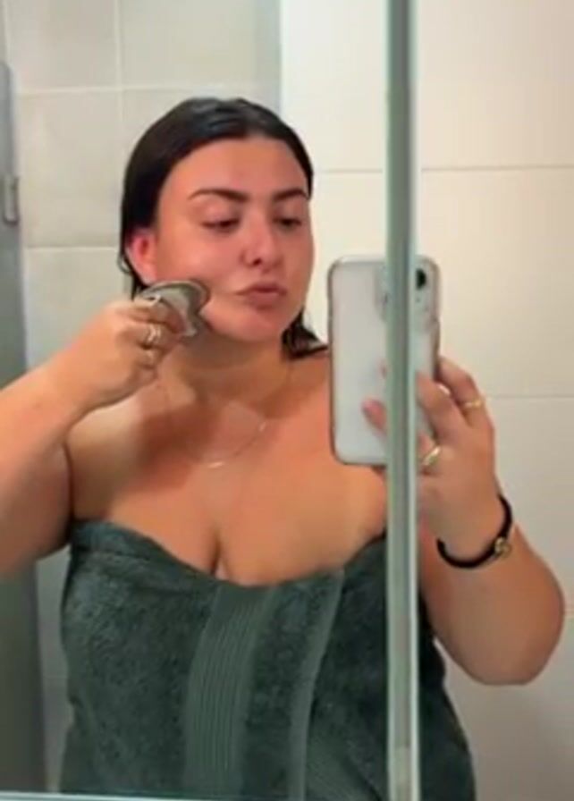 A woman wrapped in a green towel is in a bathroom, standing in front of a mirror. She is holding a phone in her right hand, taking a selfie video. With her left hand, she is using a Gua Sha tool on her face, specifically around her cheek and jawline, moving the tool upward. The bathroom has grey and white tiles.