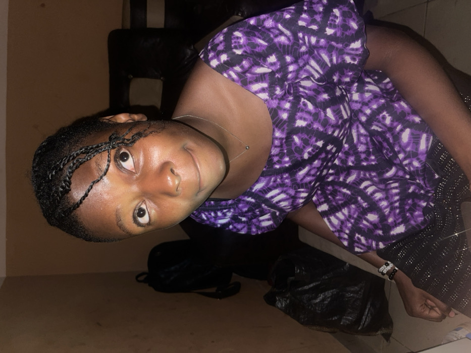 A woman smiles, looking upwards at the camera. She wears a short-sleeved purple and white patterned top and a thin silver necklace. Her hair is styled in dark braids. Two black bags rest on the floor behind her. The room appears dimly lit, with a dark leather sofa partially visible in the background. The photo is rotated, making the woman appear sideways.