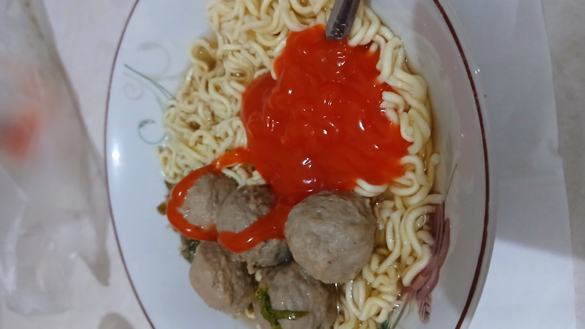A close-up, high-angle shot shows a bowl of Mie Bakso, a popular Indonesian noodle soup with meatballs. The bowl is predominantly white with a decorative rim featuring floral and swirl patterns. Inside, the noodles are topped with a generous dollop of bright red chili sauce. Several grey-brown meatballs are nestled amongst the noodles and a small amount of broth. The setting appears to be indoors, on a white surface. It is highly probable that the image was taken in the city of Lhokseumawe, Indonesia.