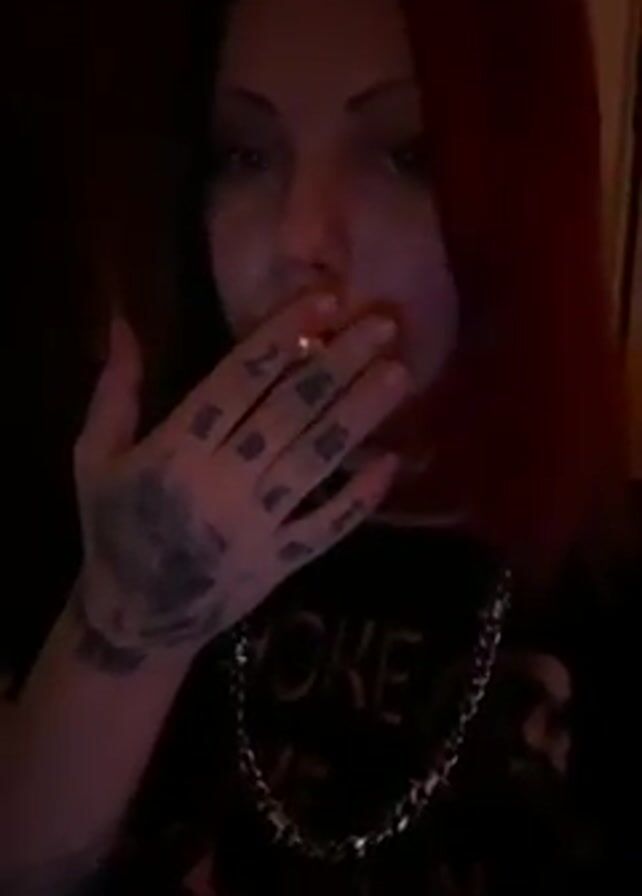 woman with red hair, wearing a black shirt with a silver chain necklace, smoking a cigarette and blowing out smoke. She has tattoos on her hand. The background is dark and unclear. There is music playing.