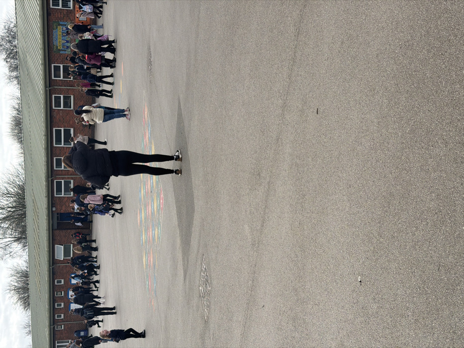 The image displays an asphalt school playground in Rotherham, United Kingdom, under an overcast sky. A single-story building with red brick walls, multiple white-framed rectangular windows, and a green sloped roof occupies the background. Signage on the building includes phrases like "THINK SMART STAY SAFE" and "READING". Behind the building, a line of bare deciduous trees is visible. In the foreground, the gray asphalt surface is unobstructed, featuring a square utility access plate on the left. A large, multi-colored geometric pattern, likely a game marking, is painted onto the asphalt in the mid-ground, consisting of interconnected shapes in red, yellow, blue, and green. Approximately 30-40 individuals, a mix of adults and children, are distributed across the mid-ground and background. A female subject, centrally positioned with her back to the viewer, wears a black puffer jacket, black leggings, and white and brown athletic shoes. Her hands are raised towards her head. Other adults, predominantly in dark winter clothing, are seen standing and conversing in small groups, or walking. Children, dressed in various casual and school-appropriate attire including jackets, are moving and standing with adults or in small clusters. One young girl in dark clothing is observed looking towards the left on the far left of the playground. A woman in the mid-right is holding a light-colored object, possibly a teddy bear or bag. The collective activity suggests a school drop-off or pick-up period.