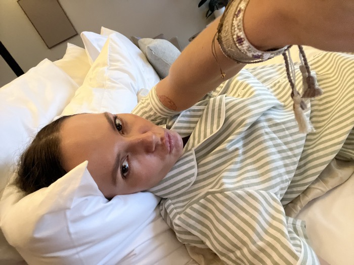 A female individual is depicted lying on her back in a bed, within an indoor setting identified as Unknown, Indonesia. She is wearing light green and white striped pajamas and rests her head on a white pillow. Her gaze is directed towards the camera, suggesting a first-person perspective photograph. A small, dark circular marking is visible on her inner left forearm. Her left wrist displays a multi-toned beaded bracelet and a small golden charm. Two decorative tassels, one light brown and one beige, hang from a string near her left arm, resting on her pajama top. The background is softly blurred, revealing additional white and light grey pillows, a light-colored wall, a dark-framed rectangular object (possibly artwork or a mirror), and partial green foliage. The environment appears well-lit.