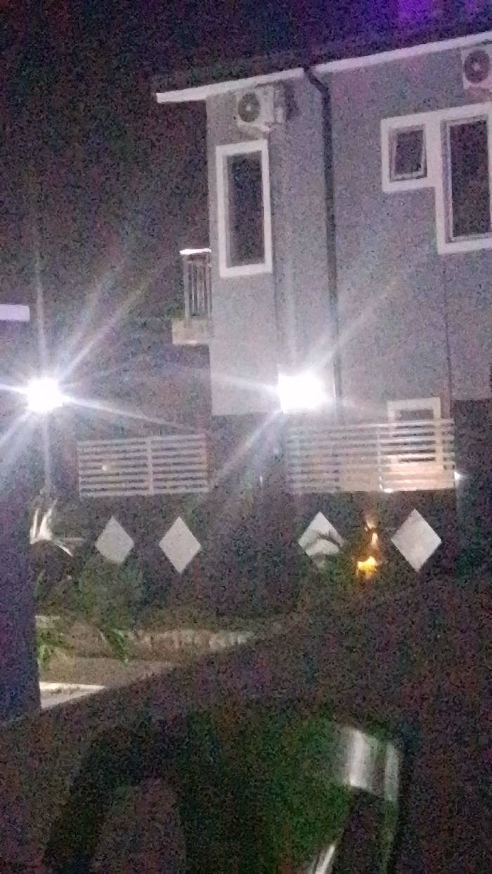 A dimly lit, grainy image depicts a gray, two-story building at night. The building features white window frames and air conditioning units mounted high on the exterior walls. A small balcony with white railings is visible on the second story. In front of the building, a low white fence with square accents lines a dark garden. Bright lights glare in the foreground, creating a starburst effect. The bottom of the image is dark and blurry, likely from the camera lens.