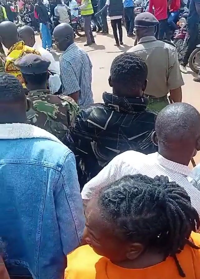 large crowd of people gathered on a dirt road in what appears to be a small town or village. Many of the people are Black, and they are dressed in a variety of clothing. Some appear to be security personnel, based on their uniforms. There are motorcycles and a few cars visible in the background. The camera is handheld and moves around, showing different parts of the crowd. A sign for a supermarket is visible in the background. It is difficult to determine the exact nature of the gathering from the video alone.