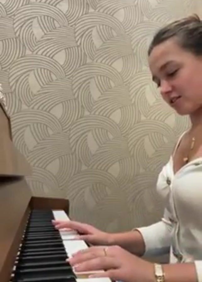 A woman with her brown hair pulled back into a bun and wearing a white top and jeans plays a brown piano. She wears a gold necklace and bracelet on her right wrist. She plays the piano while looking at the keyboard. The wallpaper behind her is white with swirling gray patterns. The video is shot at an angle from the left side.