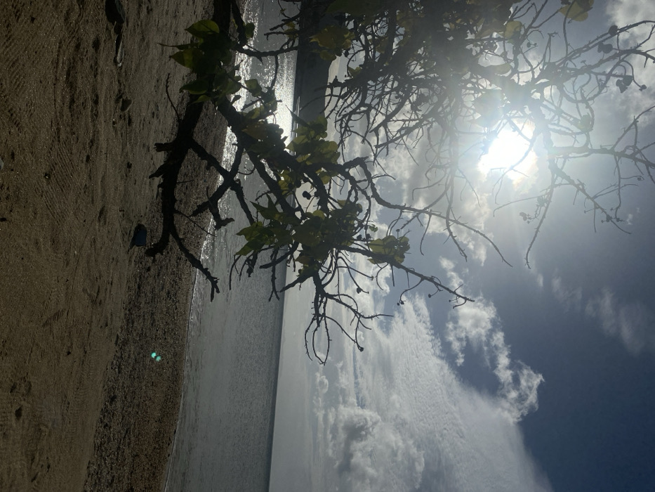 - "A beach landscape features a tree's branches with some leaves hanging over the scene, obscuring the bright sun and partly cloudy blue sky" by FM-SP1IA3, licensed under CC BY 4.0
