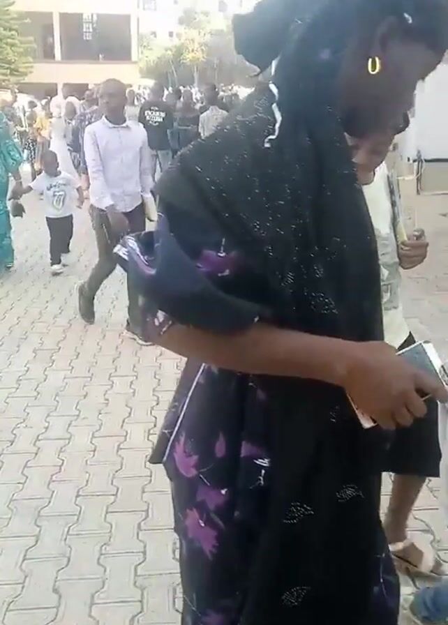 gathering of people, primarily adults and children, walking on a paved area between buildings. The paving is made of interlocking grey bricks. The adults are wearing a variety of clothing, some in traditional African dress. The children are dressed in casual wear, jeans, t-shirts, and sandals. Some people are walking in groups, others alone. The buildings are light-colored, multi-story structures with windows and what appear to be offices. The scene appears to be a public area or courtyard outside a building complex.