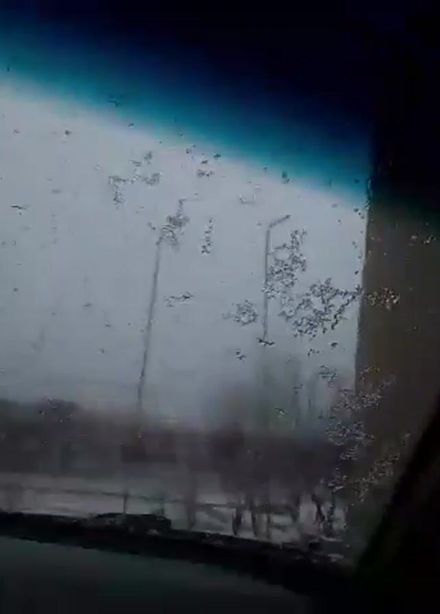 A view from inside a car during a snowstorm. The windshield is covered in snowflakes and ice, partially obstructing the view of the snowy landscape outside. Two lamp posts are visible, along with bare trees and a building partially visible on the left. The car's dashboard is black, and a blue sun visor strip is at the top of the windshield. The overall scene is white and gray due to the heavy snowfall.