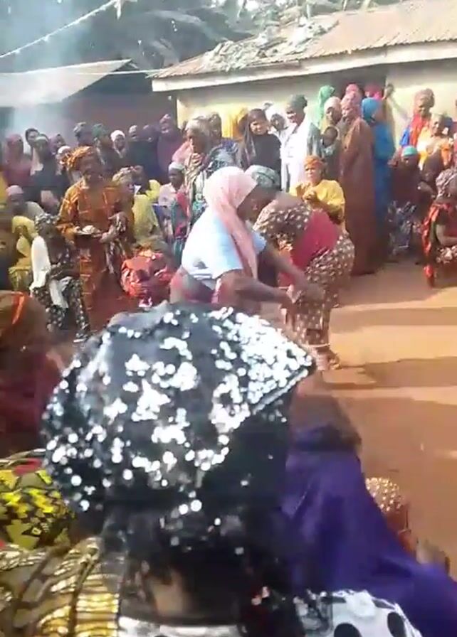 gathering of people, mostly women, outdoors, likely at a celebration or event. Many are wearing colorful traditional clothing, including head coverings. Some women are seated on the ground or chairs, while others are standing and dancing in a circle. Musical instruments are visible, suggesting live music is part of the event. The atmosphere seems lively and festive. The camera is positioned close to the ground and focuses on the people seated and the dancing in the center of the group.
