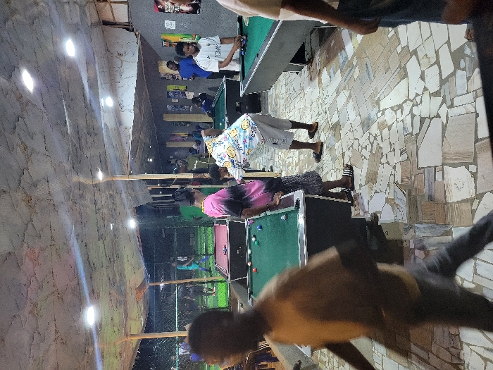 A brightly lit pool hall with several pool tables occupied by people of various ages. A few are actively playing, while others are watching or waiting. The floor is a mosaic of light-colored tiles. Posters and decorations adorn the walls in the background, adding to the lively atmosphere. The overall setting suggests a casual and recreational environment.
