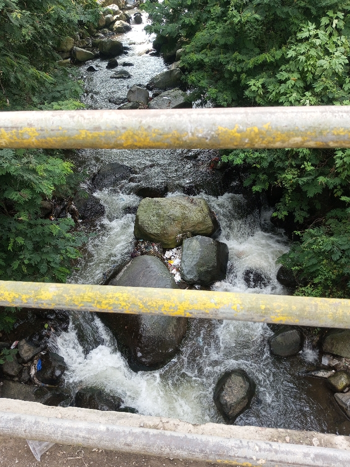 The image depicts an overhead view of a rocky stream in Sandamal Eliya, Sri Lanka, observed from a structure, likely a bridge. Two horizontal metal railings, discolored grey with distinct yellow markings, frame the middle of the scene. Below the lower railing, a concrete surface is visible. The stream flows from the bottom towards the top of the frame, characterized by numerous dark and light grey rocks of varying sizes, many partially submerged. The water is turbulent, with white foam and ripples indicating rapids around the rocks. Green, dense foliage lines both banks of the stream, filling the left and right sides of the image. Visible litter, including white plastic and other debris, is present within the stream, primarily caught among the rocks in the central area. No individuals, specific actions, or interactions are depicted.