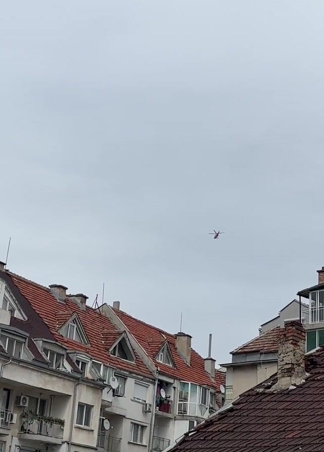 red helicopter flying in a cloudy sky above residential buildings with red tile roofs