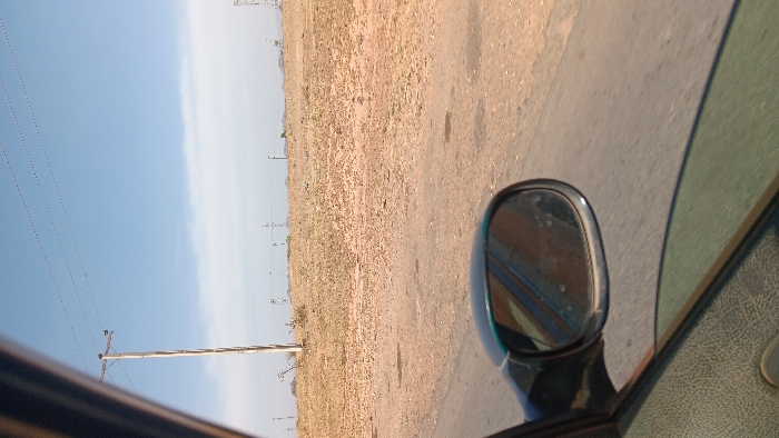 The image displays a roadside scene in Barakin Columbai, Nigeria, captured from inside a moving vehicle. The foreground on the left shows a portion of a dark, textured car door panel and the lower edge of a partially open window with a green tint. A dark-colored side mirror of the vehicle is prominent in the lower-middle, reflecting a blurry, reddish-brown image. Adjacent to the vehicle is a grey paved road. Beyond the road, a wide, dry expanse of reddish-brown and light brown earth dominates the mid-ground, characterized by sparse, dried vegetation. To the left, a tall, light-colored wooden utility pole stands, supporting multiple overhead power lines that extend horizontally across the bright blue sky. Further in the distance, towards the right, several metallic electrical transmission towers are visible against the horizon. The sky is predominantly clear blue, with a faint horizontal band of white cloud across the middle. Distant hills are faintly discernible on the horizon. No people are visible.
