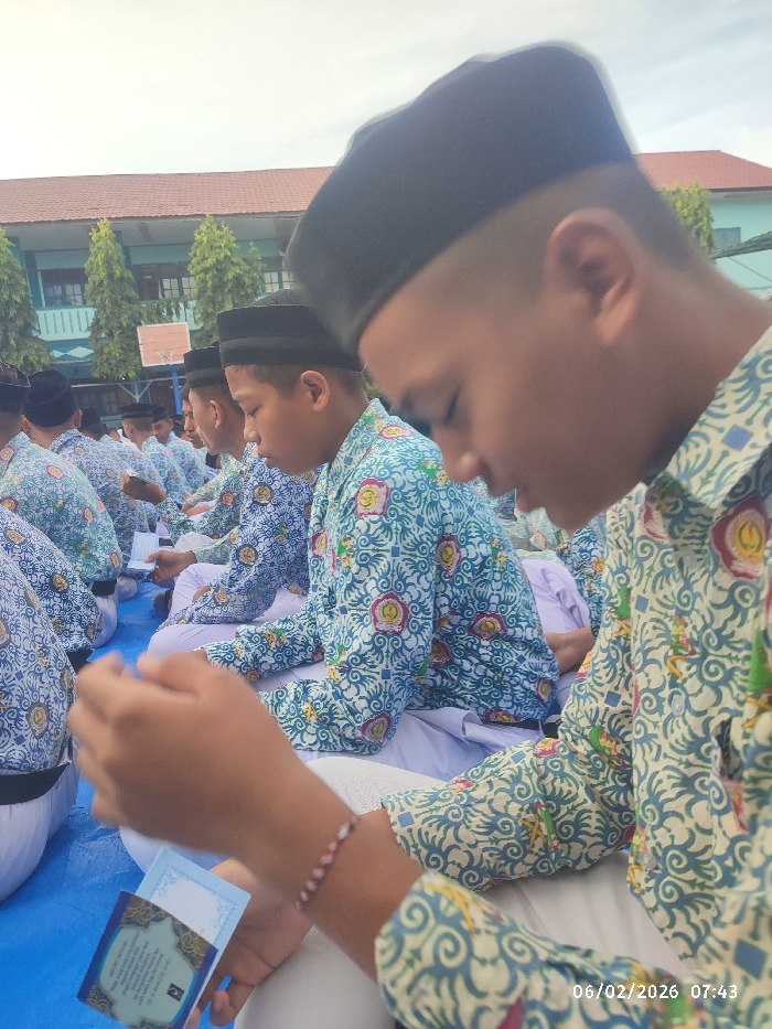 A group of young men wearing patterned shirts and black caps are sitting in rows, likely praying or reading religious texts. They are outdoors on a blue tarp with a building and trees in the background. The focus is on the boys in the front row. One of them is holding a small, blue and white booklet. A date stamp in the lower right corner reads "06/02/2026 07:43."