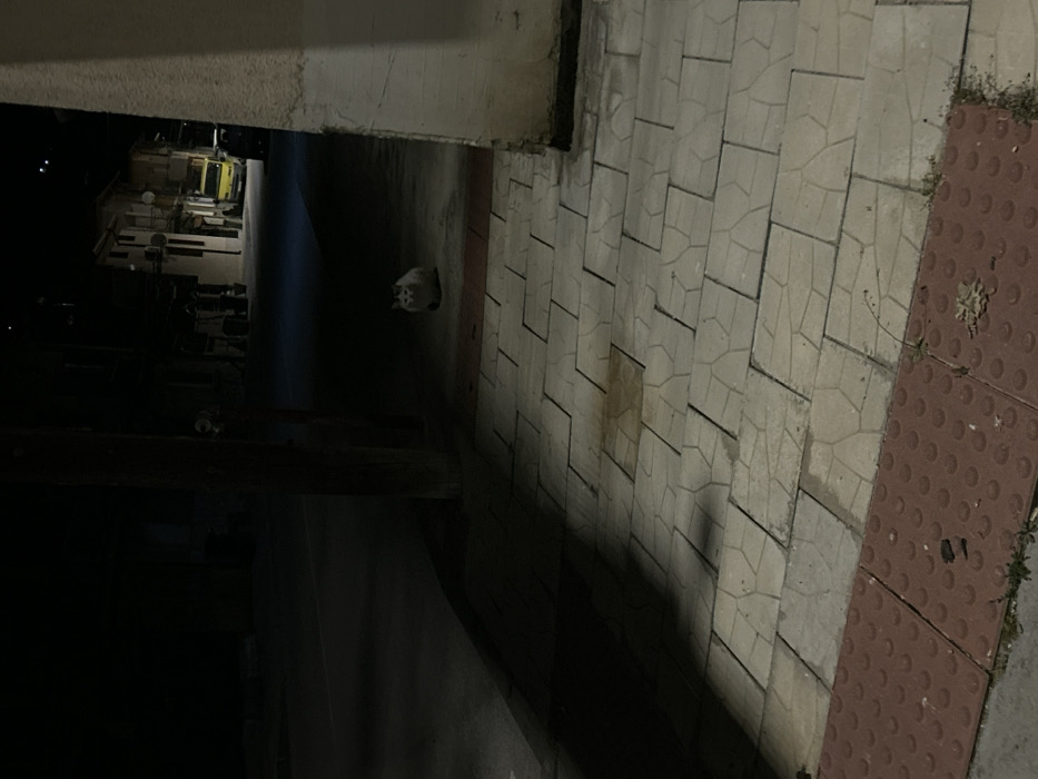 An outdoor nighttime scene depicts a street in Kresna, Bulgaria. In the immediate foreground, a section of red tactile paving with raised circular bumps is visible, transitioning to a patterned light grey sidewalk composed of square tiles. A yellowish-brown stain is present on several of these grey tiles. Small patches of weeds grow along the edges of the paving. A wooden utility pole stands vertically in the midground on the left, casting a long, dark shadow across the sidewalk to its left. To the right of the pole, a bicolored cat, predominantly white with dark markings on its head and back, is seated on the ground, facing generally towards the viewer. Its eyes reflect light. Beyond the cat and the pole, a dark asphalt road surface extends into the background. On the opposite side of the street, multiple dimly lit multi-story buildings are visible, appearing to be residential or commercial. A bright yellow utility van or small truck is parked facing right on the street in front of these buildings, with another darker vehicle partially visible adjacent to it. The sky is dark, indicative of nighttime. No people are present in the scene.