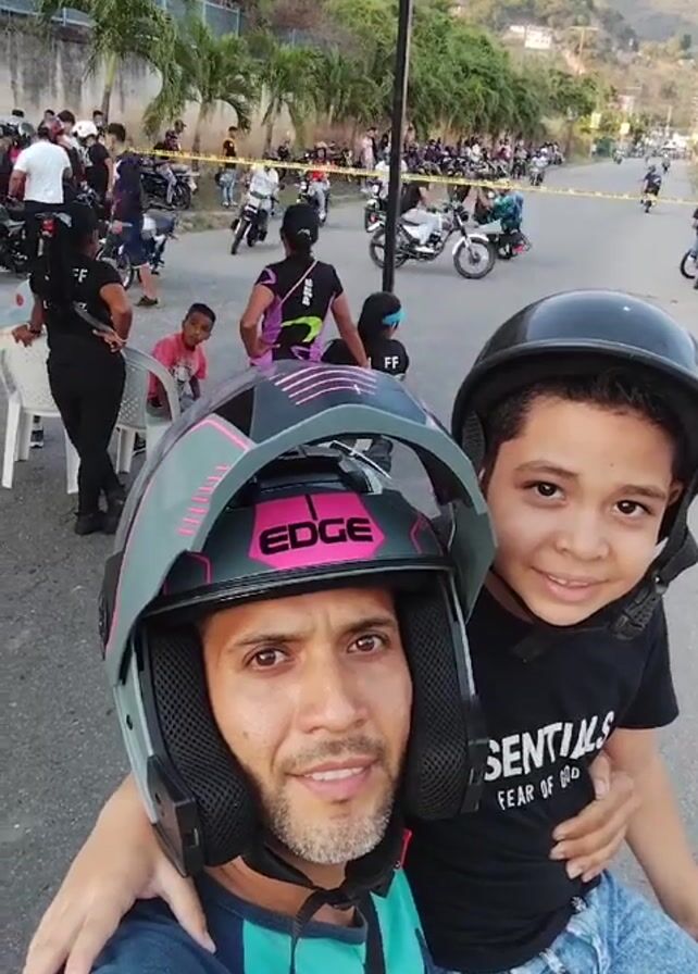 Here's a description of the scene: A man and a boy, presumably his son, are posing for a selfie. Both are wearing motorcycle helmets. The man's helmet is gray with pink trim and the word "EDGE" displayed. The boy wears a plain black helmet. The man has a short beard and is smiling slightly. The boy smiles broadly with his arm around his father's shoulder. Behind them, a street is filled with motorcycles. People are milling around the bikes, some wearing uniforms. There's a white tent structure overhead. Palm trees and a mountain are visible in the background. The overall impression is that they are at some kind of motorcycle event or rally.