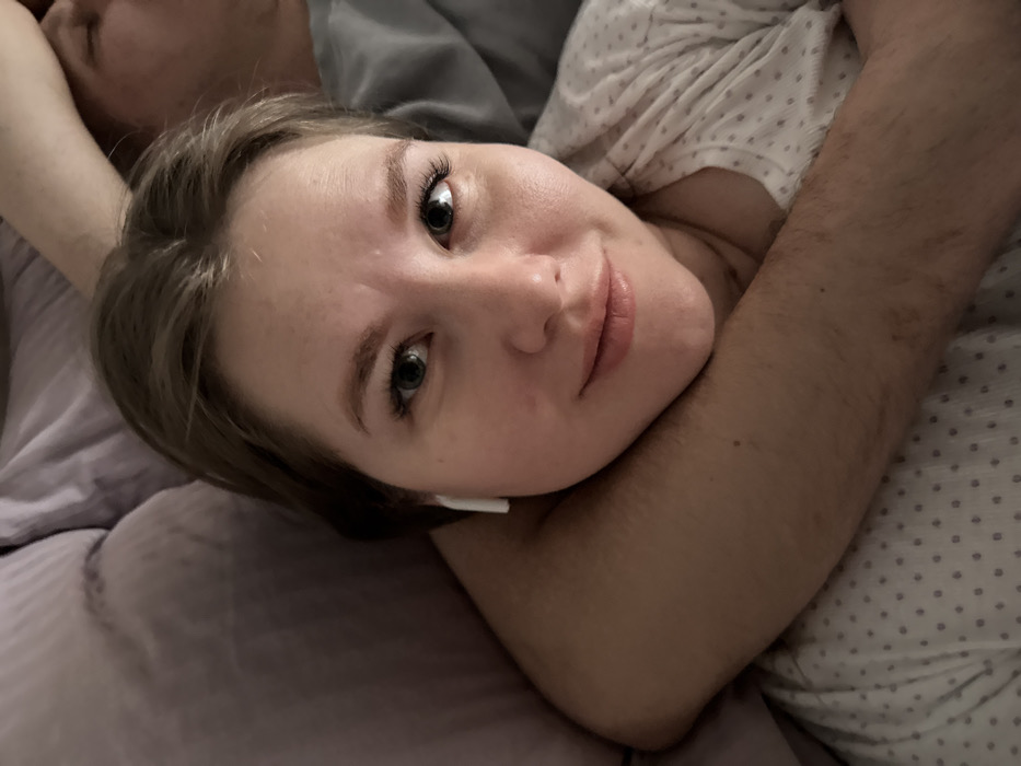 An indoor scene depicts two individuals. In the foreground, a light-skinned female subject with light brown hair, appearing to be in her 20s or 30s, gazes directly at the camera with a subtle smile. She is wearing a white garment with faint dark polka dots and has a white wireless earbud inserted into her left ear. Her head is supported by soft, light purple/lavender bedding, which also forms the background to the left. A second individual is partially visible behind and to the right of the female. Their right arm, covered in visible hair, is positioned around the female subject's neck and shoulder area, suggesting an embrace or resting posture. The upper portion of this second individual's head and face are visible in the top right, appearing to be resting or asleep, with a grey fabric (likely bedding or clothing) partially covering them. The overall lighting is subdued. The image does not contain any discernible features to identify a specific location within the city of Горный, Russia.