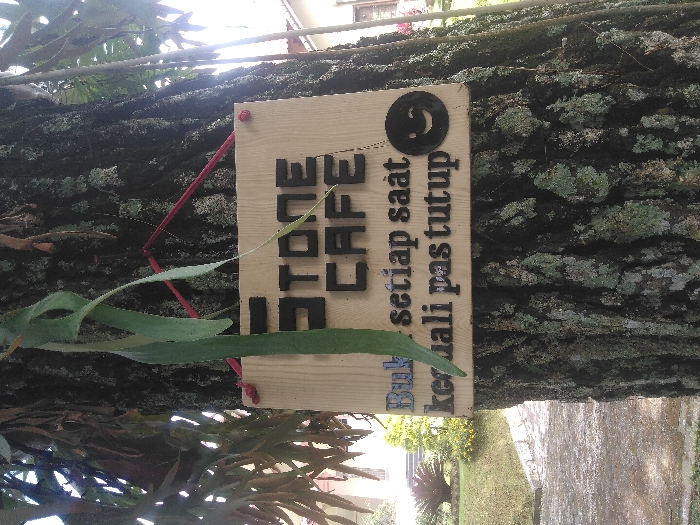 The image displays a light-colored rectangular wooden sign fastened to the trunk of a large tree in Cipanas, Indonesia