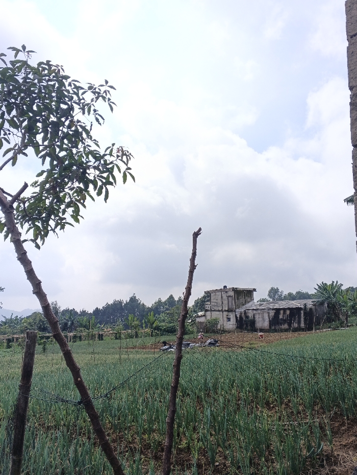A rural scene unfolds under a cloudy sky. A field of green crops stretches towards a weathered, two-story building with visible wear. The landscape features a mix of trees and vegetation along the horizon. A crude fence, supported by wooden posts, runs through the foreground, partly obscured by foliage. A tree branch with green leaves extends from the left side of the frame, contrasting with the sky and the structures in the background.