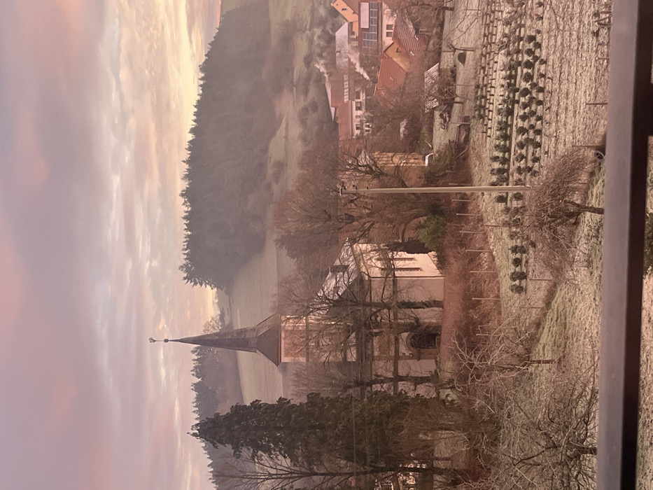 A tranquil scene reveals a church with a towering spire, nestled among bare trees, standing tall against a muted landscape. A forest stretches behind the church, partially veiled in mist, with a sky painted in soft hues of pink and yellow. Buildings and trees, likely in a village, are visible in the distance. A row of meticulously pruned trees line one side of the church. The scene is suffused with a sense of quiet serenity.