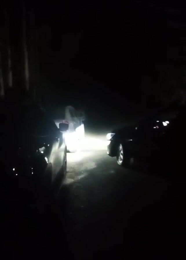 three cars parked on what appears to be a narrow road at night. The headlights of the middle car are on, illuminating the road. The other two cars are silhouetted in the darkness, making it difficult to see details. The background is a dark, wooded area. Someone can be heard speaking in the distance. The overall scene is dark and somewhat mysterious.