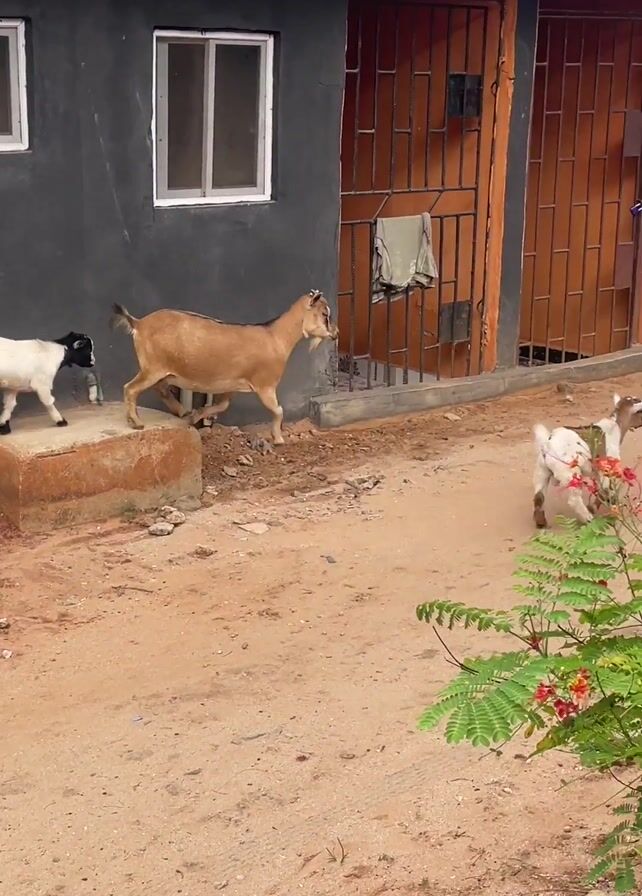 three goats – one beige adult and two white and brown kids – walking down a sandy path alongside a dark gray building. The building has a silver corrugated metal roof, two barred doors, and several small windows. The goats are moving from left to right in the frame. There are blocks of concrete beside the building, and the beige goat is standing on one initially. There are green plants with small red flowers scattered along the path. The video appears to be shot outdoors in daylight.