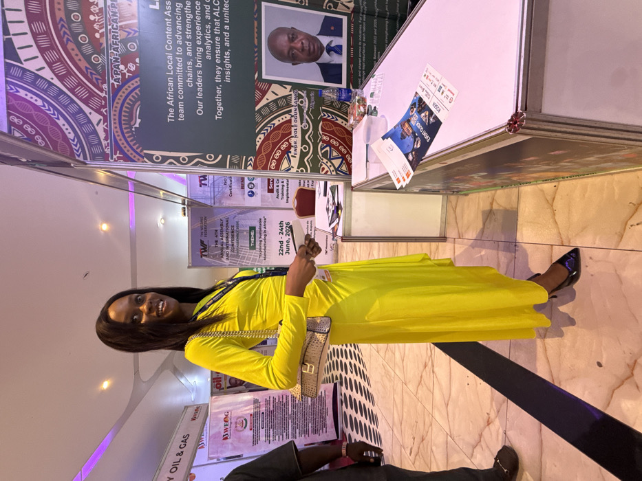 The image depicts an indoor exhibition hall, located in Itirin, Nigeria, where a professional conference or trade show is underway. A smiling adult female with long dark hair stands centrally, wearing a long-sleeved, asymmetrical yellow dress, black high-heeled shoes, and carrying a light-colored shoulder bag with a gold chain strap. An identification badge is visible around her neck. In the background, multiple exhibition booths are visible. A prominent banner for "The Welding Federation (TWF)" advertises "The 4th Annual Assembly and International Conference," with the theme "Inspiring Sustainable Manufacturing in Africa," scheduled for "22nd - 24th June, 2026" in "Maputo." Another banner to the right features a portrait of "Engr. Hole Ogun-Anwo" and text related to "The African Local Content Association." A banner on the far left, partially visible, mentions "OIL & GAS." To the woman's right, a white display table holds an "EVENT GUIDE" flyer, a bottle of water, and a clear container of small items. The flooring consists of polished light-colored tiles with a dark linear accent. Overhead fluorescent lighting is visible. A person's lower body, wearing brown sandals, is partially visible on the far left. The woman is looking directly at the camera while holding a small, light-colored object in her left hand.