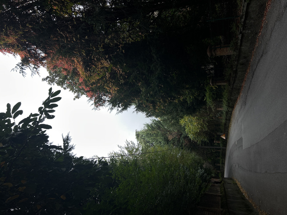 The image depicts a winding asphalt road through a tree-lined, possibly residential or rural area within the city of Lezza, Italy, under an overcast sky. The road, dark gray, curves gently to the left in the foreground and continues uphill into the background. Scattered dry leaves are visible along its edges. On the left side of the road, a dark retaining wall supports a dense embankment of green foliage and tall trees, some branches extending overhead. A single dark cable or wire hangs vertically downward from the foliage, near the center-left. On the right side, a lower wall runs parallel to the road, featuring several uniformly spaced, short, brick or stone pillars with rounded caps. Behind this wall, dense trees and bushes dominate the landscape. A prominent tall tree on the right displays reddish-orange autumnal foliage amidst dark green conifers. A triangular yellow warning sign, partially obscured by greenery, is visible mid-ground on the right. A metal fence is discernible behind the pillars and foliage further along the road. No individuals or vehicles are present in the scene.