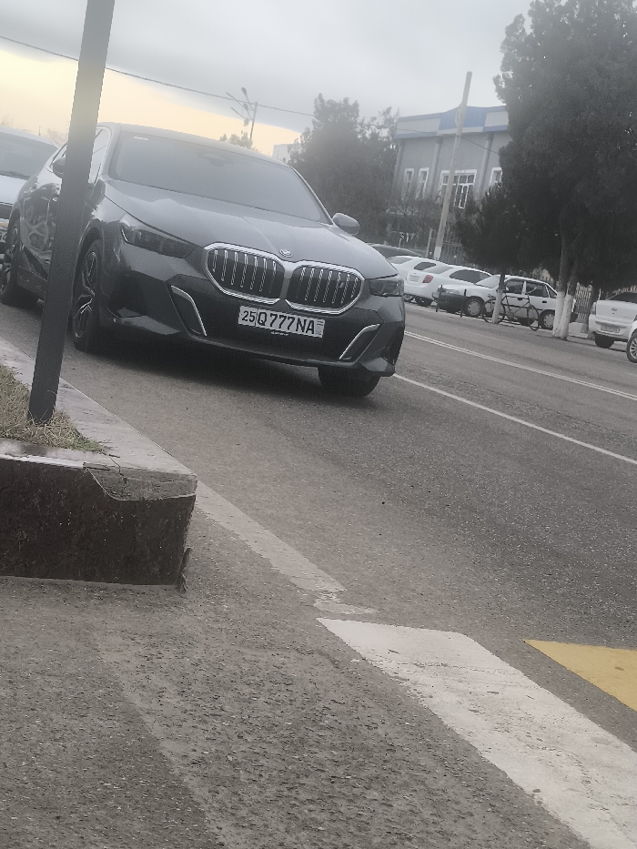 The image depicts a static street scene in Pakhtakor, Uzbekistan, under an overcast sky during daylight hours. A dark grey BMW sedan, bearing Uzbek license plate "25 Q 777 NA," is prominently featured in the foreground, parked at an angle on the right side of an asphalt road. Its front fascia, including a large grille and headlights, faces slightly towards the right. A dark vertical pole partially obscures the left side of the vehicle. To the immediate left of the road, a concrete curb with dry grass on top indicates a raised area or sidewalk. The asphalt road surface displays white pedestrian crossing markings and a partial yellow corner marking. In the midground, further down the street, multiple other vehicles, predominantly white sedans, are parked parallel to the curb. A bicycle is visible near one of these parked cars. In the background, deciduous trees with bare branches line the street, and a multi-story building with a light blue and grey facade is visible behind them. No individuals are present, and no actions or interactions are discernible.