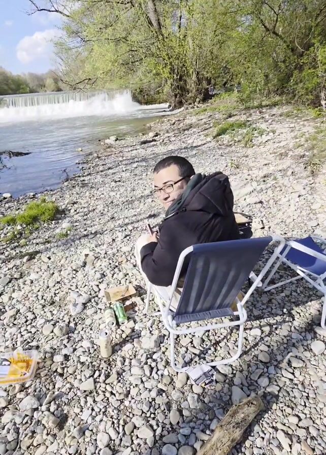 A man is seated in a folding chair on a rocky beach near a river with a small waterfall. He wears glasses, a black jacket, and light-colored pants. He holds a mobile phone in his hands and looks toward the camera. Next to him are two empty beer cans, a carton of food, and other small items. A second folding chair sits nearby. Someone extends a small stick towards the seated man. The background includes trees and a blue sky with scattered clouds. The overall environment suggests a casual outdoor setting.