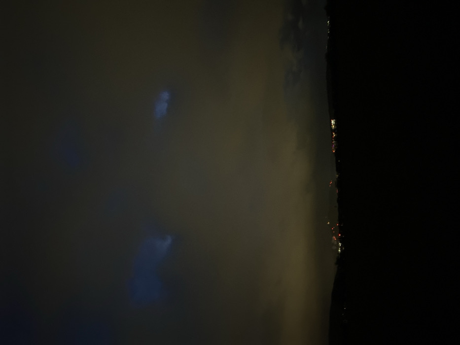 The image depicts a nighttime landscape over an urban area, specifically identified as Glattbrugg, Switzerland. The sky is largely obscured by dense, dark cloud cover, which reflects ambient light, creating a muted yellow-gray hue across the upper atmosphere. Within this cloud layer, two distinct, irregularly shaped patches of diffuse blue light are visible: one larger, elongated patch in the upper-left quadrant, and a smaller, more concentrated patch in the upper-right quadrant. The lower third of the image is dominated by a dark, silhouetted expanse of land, likely elevated terrain or distant hills. Along the horizon, above this dark silhouette, a scattering of artificial city lights is visible. These lights appear as clusters of orange, red, and yellowish-white points, indicating urban infrastructure and potentially warning lights on distant structures within the Glattbrugg area. No individuals or specific actions are discernible within the frame.