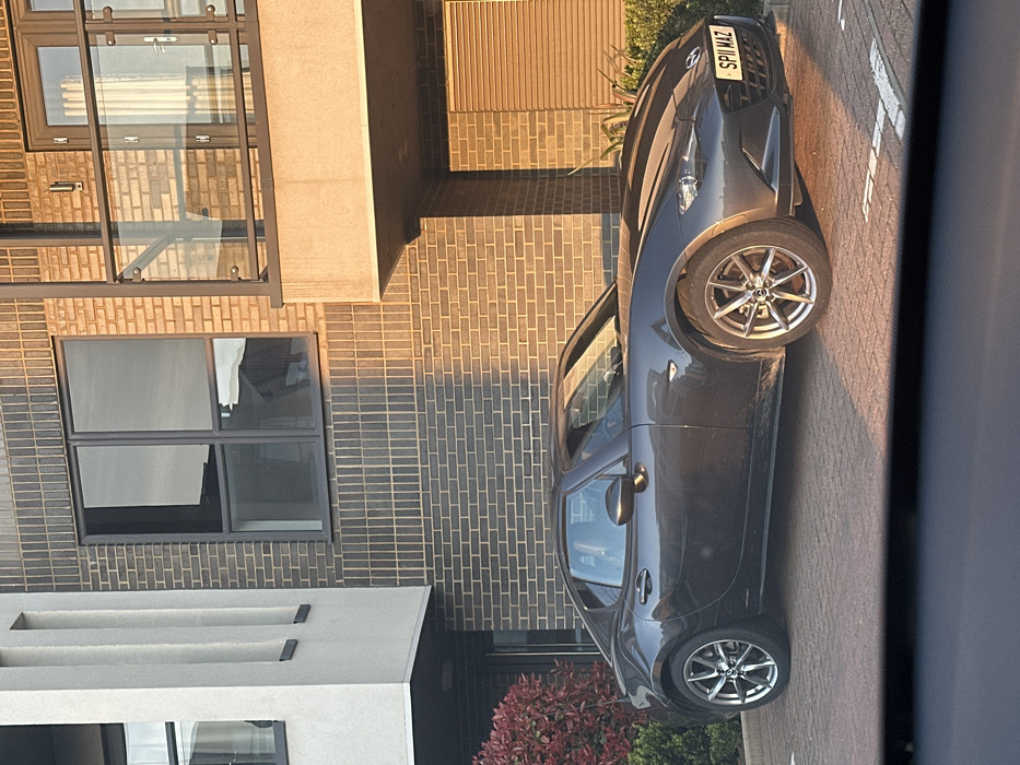 The image depicts a dark grey Mazda MX-5 RF coupe parked in a modern residential area within Gillingham, United Kingdom. The vehicle is positioned facing slightly to the left, occupying an interlocking brick paved parking space, with partial white parking lines visible on the ground. Its front license plate, "SPI1 MAZ," is clearly legible. The car's multi-spoke alloy wheels are visible, with the front wheel appearing slightly turned. In the background stands a multi-story residential building, likely an apartment complex, constructed with dark grey brick cladding and sections of lighter, possibly white, rendered finish featuring vertical architectural elements. A large, dark-framed window is present on the first floor. Above it, on the second floor, a balcony extends with a glass and metal balustrade. To the left on the ground floor, a dark entrance door is visible, flanked by a dense red-leafed bush. To the right of the entrance, underneath the balcony, a large, light-colored concrete or rendered section is present, with a horizontal slatted vent at ground level. The scene is illuminated by low-angle, warm sunlight, casting long shadows across the paved ground, indicating late afternoon or early evening. Reflections in the building windows suggest a bright sky. No individuals are present or engaged in any actions or interactions within the frame. Green foliage is partially visible along the base of the building to the right.